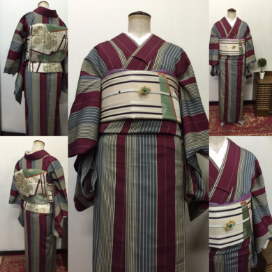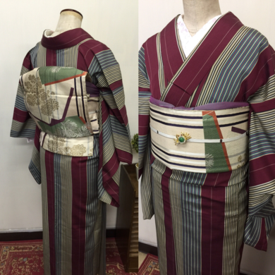 | 着物について | 単衣の昔着物と、ちりめん地の柔らかな昔帯を合わせて着せてみました🌟 どちらもとても古いお品です。 お着物は一箇所ちっちゃな穴がありましたが、他は状態も良く綺麗です* 帯はシミが出ていますが、こうしてしめてあげると隠れて目立たず素敵です✨ 久々に着てもらって、お着物も帯も喜んでいるような気がします😃 帯留め代わりのブローチは蟹さんです♡ |