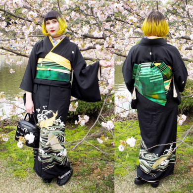| 着物について | 黒い着物を着るイベントに参加して、黒留袖を選びました。 名古屋帯を後見結びにしました。小物は髪色と合わせる(笑) |