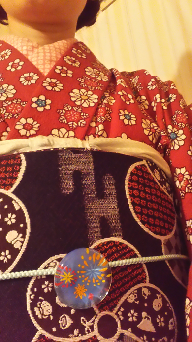 | 着物について | 屋台の並ぶ夜店へ、すこし早い夏祭り気分を味わいに。 雨だったので、ポリエステル素材の着物と帯です。 浴衣のひとも多いと聞き、着物でもお祭りらしくするために、花火模様のガラス細工の帯留めをしました。バッグは籠。 |
