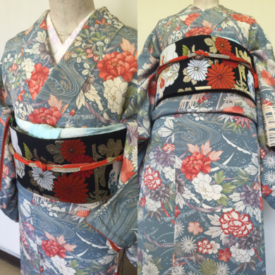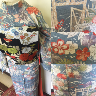 | 着物について | 今日のお着物は、50代くらいの方の、おばあさまのお着物だよ、 と言ってお譲り頂いたお品です🍀 もしかしたら本当のアンティークにあたるのかもしれません✨ 素材は優しい手触りのちりめんに一面華やかな柄が描かれています。 柄の一つ一つが力強く、生き生きとした表情が素晴らしいと思います🌟 裏生地は、古いですが上質の絹地でシャラシャラと絹づれの音がします。 おびは、昔帯で正絹にたくさんの色を使った花柄になっています。黒地が色を引き締めてくれました😃 |