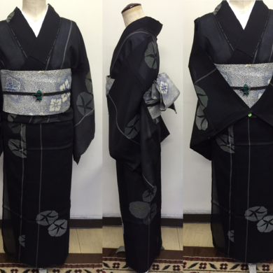 | 着物について | 今日のお着物は昔着物、紗の涼しげなお着物です♪ しつけが付いたまま、長くしまわれていた感じのお品ですが、 小粋な薄ーい黒の生地に、かわいいアサガオか夕顔の柄が、ところどころにあるお着物です💖。 帯は、昔の半幅帯で、ダメージがありますが、頑張って一働きしてもらいました^o^🍀 真夏の夜の夢のような雰囲気の、ロマンティックで、あやしく、美しい、お着物と帯のコーディネートです✨ |