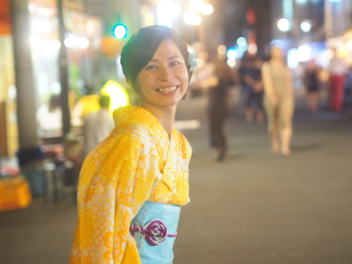 | 着物について | 夜の浅草散策のために、明るい黄色の浴衣を選びました。帯と髪飾りをブルーにして爽やかに〜☆ |