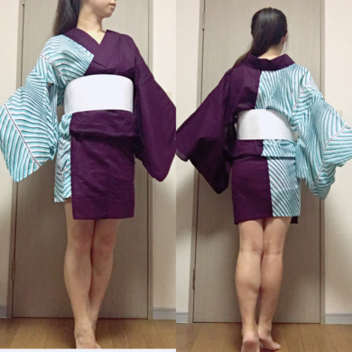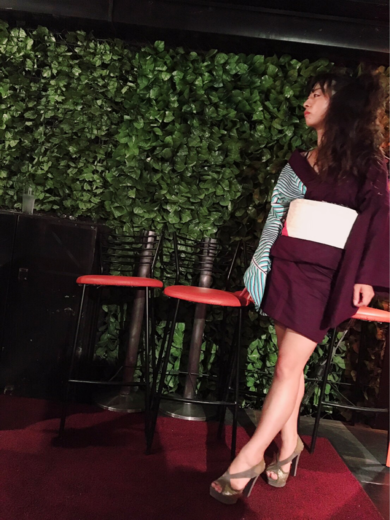 | 着物について | ドレスコードは浴衣☆でのクラブイベントにて。 ろっこやさんで去年購入した方身変わりの綿麻着物を膝上丈で着付けてみました♬ |