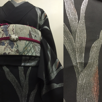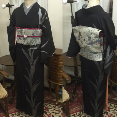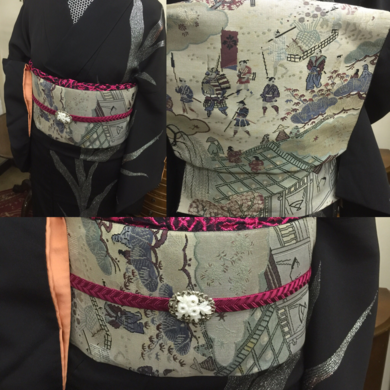 | 着物について | まだまだ暑い毎日ですが、今日は袷のお召しのお着物を着せてみました🍀 黒の上等な絹地の上にマジョリカ着物のような刺繍が大胆に施されています。 裾から肩、袖までとても贅沢です。 帯は、正絹名古屋帯、江戸時代のような面白い柄が入っています。 大名行列のような感じですが、お花が運ばれていたり子供が見ていたりしますので、 もしかしたら、昔のお花見?、と思ったり、不思議な柄だなぁと思いました😃 |