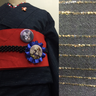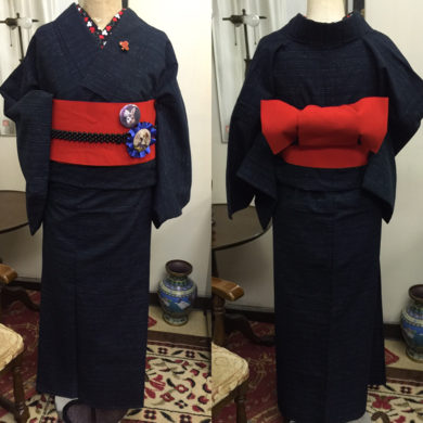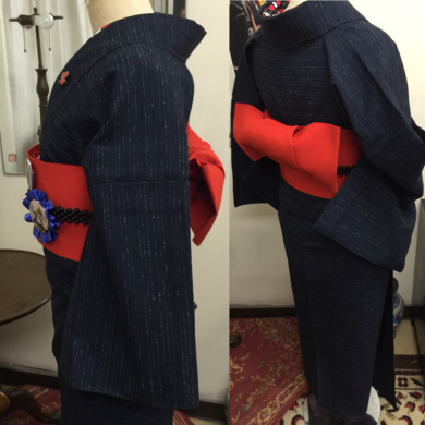 | 着物について | 今日のトルソーは、単衣のウールのお着物です👘 お色が落ち着いた感じの紺地の上に自然素材のような糸が織り込まれた横線が入っています。 白い半襟などでキリッと粋に着るのも似合いそうですが、 今日は朱赤の半幅帯を合わせてみたくなりました🍀 なんのへんてつもない帯なので、アリスのカンバッチにkinopi-sさんのうさぎのカンバッチ、胸元に♠️のブローチと、付けてるうちにデコデコになってしまいました😺 もちろん半襟も♠️♥️♣️♦️柄なのです😊 |