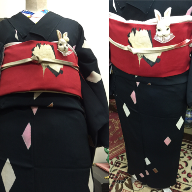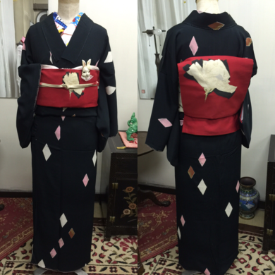 | 着物について | 今日のお着物は、お嫁入りが決まっているアンティークキモノです。 汚れがなく大きさもまぁまぁあるので、とても良い状態のお品でした💓 手書きのようなダイヤ柄がポツポツと置かれたかわいい柄ですが、地色は落ち着きのある深緑の絶妙なバランスの色合いです👘 帯は、正絹名古屋帯、こちらも古いお品でシミがポツポツと出てしまっていますが、こうしてお着物とあわせるととっても素敵です。 帯も嬉しそうです✨ 帯揚げに着けたうさぎのブローチは、KINOPI-Sさんの作品です💕 KINOPI-S作品は、手の込んだ一点一点手作りのお品です✨ ラブズキモノ作家さんページ第一号として、商品を紹介させて頂いております。 作家ページをクリックして見ていただければ、とっても嬉しいです😊 |