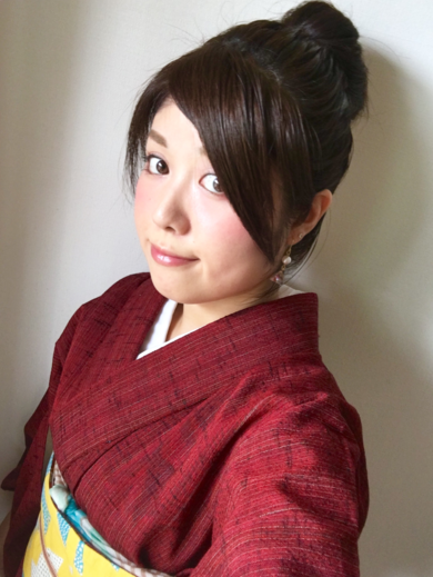 | 着物について | 9月に入り、肌寒くなりました。 ウール、臙脂色の単衣。 黄色い手作り帯と合わせて、ポップに元気に着こなしました♪ ピアスは、好きな染物アーティストさんの作品☆ そして、実は、足袋も手作りです♡ |