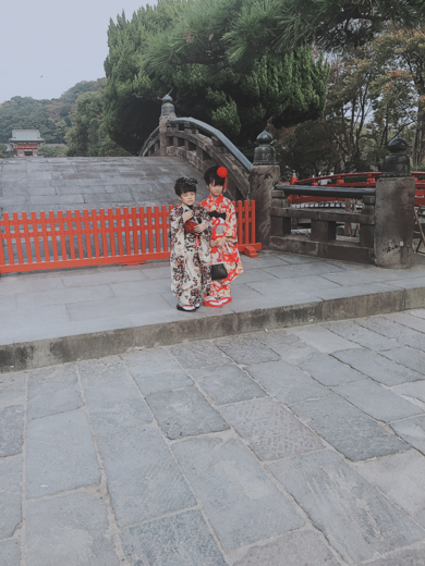 | 着物について | 2人で歩いてかわいいコーデ♡ 赤と黒、和と洋、でも全体は、似たシルエットにまとめて。 ヘアも、編み込み入り和髪♪ |