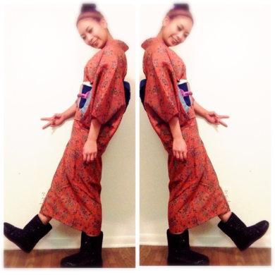 | 着物について | 小紋の着物にムートンブーツを合わせてお出かけです。 |