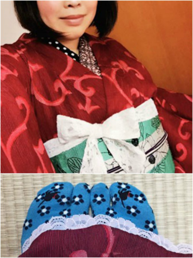 | 着物について | アンティークの唐草紋様小紋。 帯結びは風船太鼓です。 裾が切れてしまったのでレースでカバーしました。 帯揚げのリボンもレースで☆ |