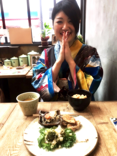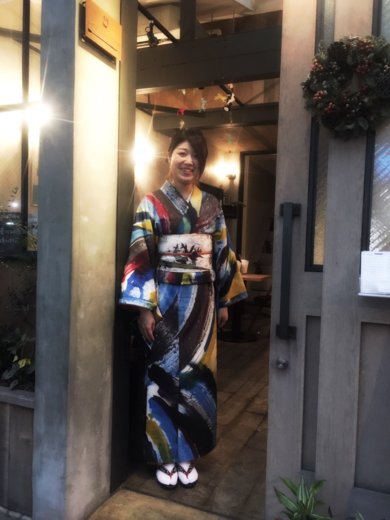 | 着物について | 奄美大島紬に大胆に描かれた反物を、自分サイズに仕立てて頂きました♡ オーダーメイドは初めて♡ とっても素敵なカフェで、 写真撮影させて頂きました♪^^ |