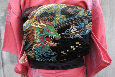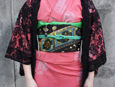 | 着物について | ピンクはあまり好きな色ではありませんが、黒などと合わせたら雰囲気が変わりますね。 ピンクのウール単衣とレース羽織、手書きのドラゴン名古屋帯のカジュアルなコーデです。 簪は手作りです☆ |