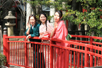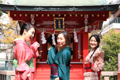 | 着物について | 『深川おどり』の「夢芝居」ワークショップに参加した仲良し三人娘☆ とても素敵なお着物コーデでした。 ワークショップの会場は江戸最大のパワースポットの一つである富岡八幡宮! お稽古後は境内を散策しました♪ 七渡神社の弁天様に踊りが上手くなることと良縁を祈願♡ お使いの白蛇に遭遇したら心願成就間違いなしだそうですよ! |