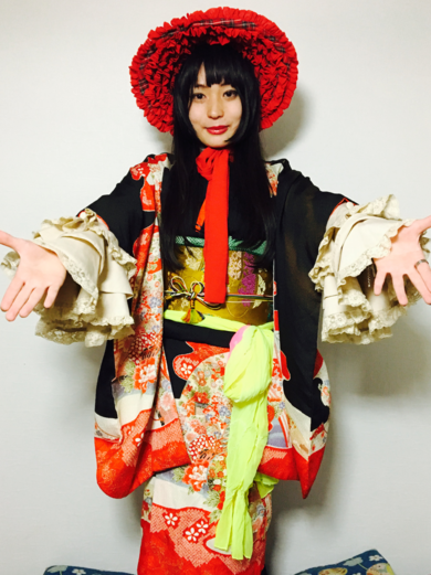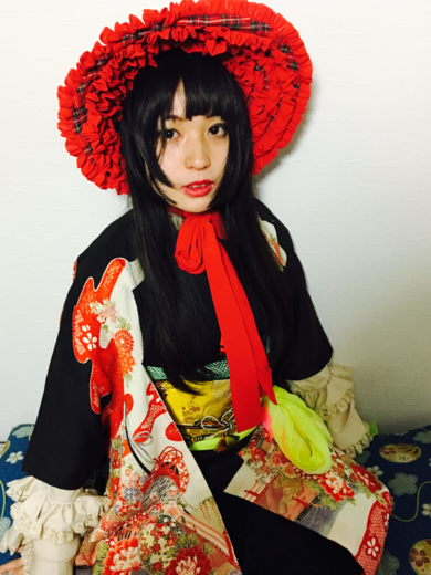 | 着物について | アンティークのお着物にブラウスやスカートなどを合わせて、文化人形風に着てみました。 |