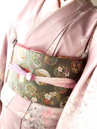 | 着物について | 息子の卒業式の予行練習で着ました。 帯は、さりげなく鶴の柄が散りばめられています。 |