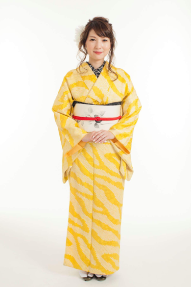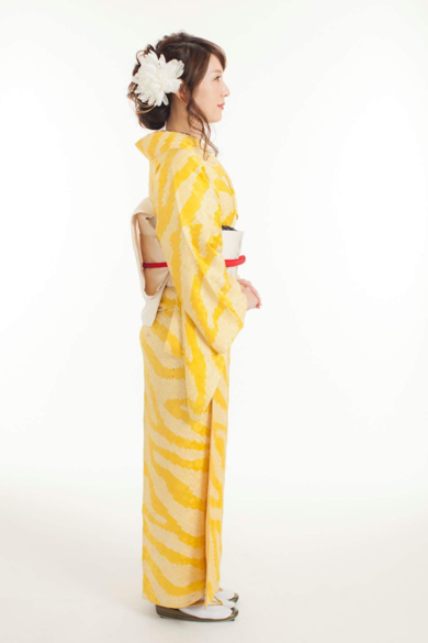 | 着物について | 浪漫和装品店のイベント「浪漫着物コーデで撮影会」 の写真です。 「小狐丸イメージコーデ」を着てもらった一枚。 黄色の絞りの着物に、白地の塩瀬の帯、帯締めに赤、半衿を黒地にコーディネートしました。 ちなみに刀は膝丸です(模造刀を貸していただきました) ヘア、メイク、着付け、カメラマンと流石プロの技の集大成! 横で見ててニマニマして変なテンションでした。 |