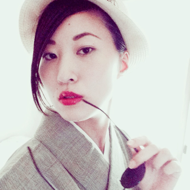 | 着物について | タイで買った帽子とサングラスを合わせてクールに仕上げてみました。 男性ものの着物なので、赤のリップで女度を上げて。 |