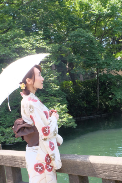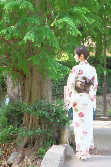 | 着物について | ベージュ地の浴衣で落ち着いた雰囲気に |