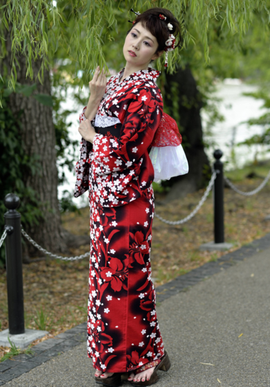 | 着物について | 今年ももう八月下旬。浴衣シーズンが終わりとなりますね。 こちらは七月下旬に行われた全東京写真連盟による上野不忍池大撮影でのお写真です。 元気に育った大きな蓮の池や、柳、アヒルボートの池などを背景に撮影するとの事でしたので、 緑や茶色の多い背景に映える色、でも、少しでもスラリと見えるようにと・・・大柄の中にもアクセントのある浴衣を選んでみました。 どちらも10年ほど前の既製品で、下駄はこちらも同じ頃に購入した高さのあるANNA SUIです。 髪型は・・・今年は敢えて前髪を短くして前髪を上げないようにしました。若作りの意図もありますが(笑)風でなびいて前髪が上がった時に顔のイメージがガラッと変わって見えるからなんです。 男性陣は、その瞬間にドキッとされる方もいらっしゃるとかいないとか・・・ 髪飾りはあまり重く見えないつまみ簪やシフォン素材の髪飾りさし簪など・・・髪型をシンプルにしている分、こちらは盛りっとつけてみました。 自分サイズに仕立てたキモノを着慣れていると、やはり既製品には違和感がありますが・・・ サイズや大きめの着丈のお品を選ぶなどして、少しでもスラリと見えるように帯の位置を高めに、浴衣といえども着丈は長めに、帯結びもレースの兵児帯を多用するなど少し変わった使い方をしています。 帯板もレース付きのメッシュをご愛用。どちらの浴衣も綿紅梅、赤い浴衣の帯は博多織です。 この日はもう一枚着ましたが、一人で写っているお写真が無かったので掲載できず残念です。そちらは綿の反物から自分サイズに仕立てたものでしたので、やはり着心地最高でポージングもし易かったです。 浴衣も反物で自分サイズに・・・は、オススメですよ!お値段もそれなりにしっかりしている既製品とはそんなには変わらないと思います。 しかしながら・・・三月頃から新柄が出始めて、浴衣を着たくなる頃には人気柄はほとんど売り切れてしまいますので、お仕立て期間も必要ですしご準備はお早めに! 今年の夏の衣装での、扇子、団扇は・・・歌舞伎座タワー地下の日本橋伊場仙さまにて手に入れることが多かったです。蛇の目傘は和傘の杉崎商店さんにて♪ Photo by Kagerou & ふかちゃん |