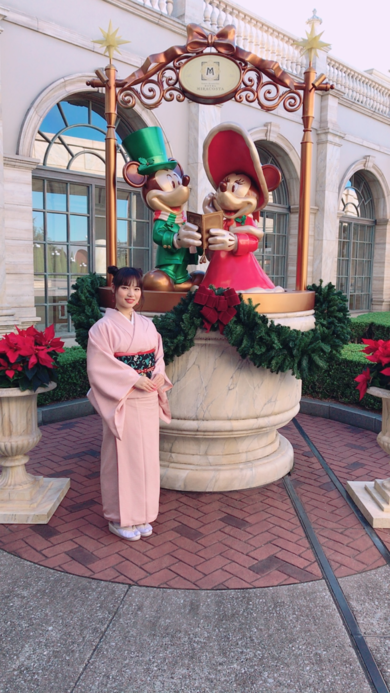 | 着物について | イマドキなピンクの千鳥柄に、黒の帯。髪型もディズニーらしくミッキーヘアに(*´∀`) |