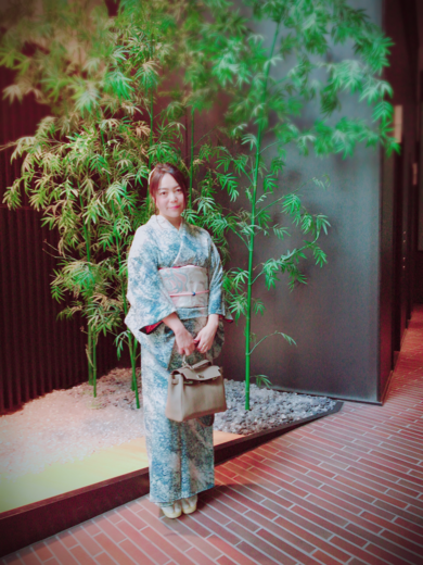 | 着物について | 友人と六本木着物ランチ バラの小紋にシルバーの渦巻きの名古屋帯をコーディネート、友人は叩きぼかし染の小紋に大輪の薔薇の袋帯を合わせました。5月らしいさわやかな着物でした! |