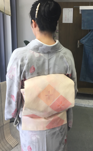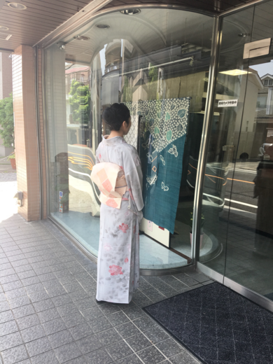 | 着物について | 今日は気温が高いので単衣の着物にしました。 無線手描き友禅の薔薇の小紋に、ひし形文様の引き箔名古屋帯を合わせました。 薔薇の刺繍半襟と白サンゴの帯留めがポイントです。 |