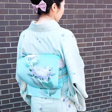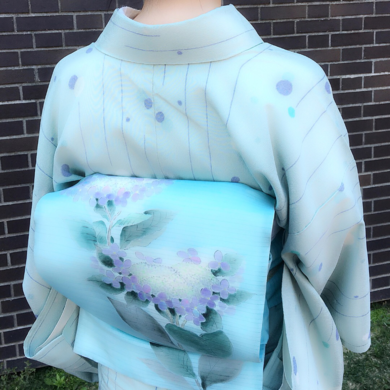 | 着物について | お庭に咲いた額紫陽花を帯に描きました。 水玉ブルーのお召し紬で、涼しげに。 |