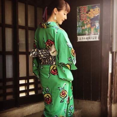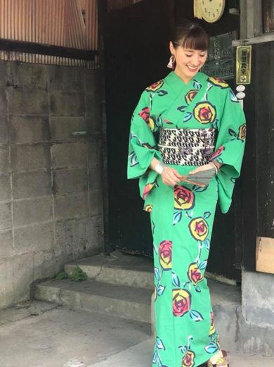 | 着物について | 今回のゆかたスタイリングは、 ・注染の抽象画のバラ柄の綿コーマ浴衣 ・千鳥格子のリバーシブル正絹半幅帯 ・黒+銀の正絹3部紐 ・帯留めの代わりに、1970年代の母のベルトのバックルを使用 ・裄が短いので、手首にバングルとブレスレットを着用 着丈が短いので、対丈で着付けをして、 帯び結びは、貝の口結びをキュッと小さく結んでいます。 2018年7月8日にゆかたイベント開催します。 着付け、帯び結び、ゆかたメイク、スマホ撮影&ポージングと盛りだくさんの内容です! 詳しくは「5carats」のイベントをご覧ください。 http://www.kimonobijin.jp/event/detail.asp?id=546 |