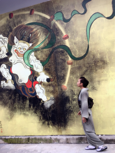 | 着物について | 正絹単衣の着物に兵児帯で。 日本の台風被害が広がらないよう、風神雷神様にお願い。 |