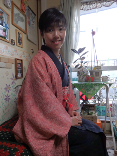 | 着物について | コーディネイトのポイントは紺色の紬に赤い羽織です。撮影当時は冬だったので、暖かみのある感じにしてみました。赤い帯も合っていてとても良い感じになったと思います。着物の紺が渋い分、羽織もので全体的に若々しさを出してみました。 |