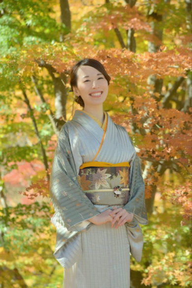 | 着物について | 紅葉の季節に合わせて、帯が紅葉柄です🍁紅葉が映えるようなグレーの色味と帯揚げはオレンジでコーディネートしました💕 |