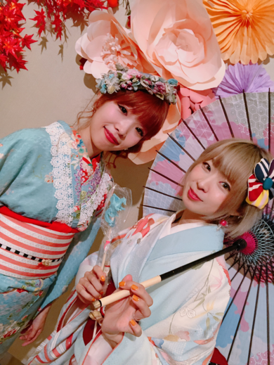 | 着物について | お気に入りのアンティーク着物👘刺繍もはいってて色合いがかわいい一着♪ お花のヘッドドレスと合わせました。 左は飴細工アーティストの蜜咲ばぅちゃん♡ |