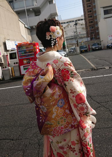 | 着物について | ショートカットを髪飾りで可愛くアレンジしてもらいました♪ |