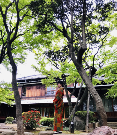 | 着物について | 幾何学模様のオレンジ系お着物にチェックの帯。 大人かわいいお着物コーデで新緑との相性バツグン♪ |