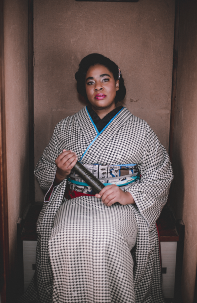 | 和服穿搭介紹 | These were graduation photos taken by Stasia Matsumoto of InKimono. I am wearing a houndstooth furisode from Kimono by Nadeshiko, a funky comic fukuro obi by Modern Antenna, and a red shigoki obi. My style tends to be more contemporary and loud. Because I am not within the traditional age for furisode, I wanted a pattern that would be more chic and muted while I let my obi do the talking. . |
