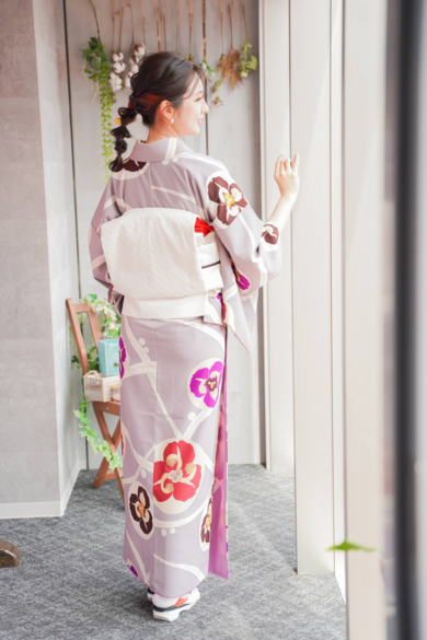 | About My Kimono Outfit | 芸艸堂のきもの「露芝に蘭」山本雪桂の柄となります。 個性あふれる柄に白レースの名古屋帯、パールの帯留を 合わせることで上品な着こなしに。 ヘアアレンジも凝ってみました。 |