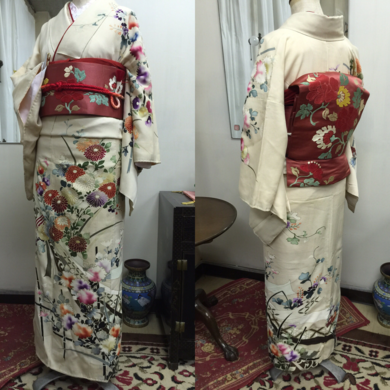 | About My Kimono Outfit | 柔らかく、さっぱりとした手触りの、ちりめん地の、昔のお着物です💕 沢山の花々が、これでもか、と描かれています。 大胆に大きく描かれた菊やその他の花々が、昭和レトロな雰囲気を醸し出しています、大胆で花々しくて、戦後、日本が復興し、のびのびと経済成長した頃の大胆な雰囲気が感じられるようなお着物だと思います。 帯は、もう少し古い時代物だと思いますが、こちらは、名古屋帯です。 ツヤツヤした上質の絹地の上に可愛らしいお花が大きく刺繍されています。 とても綺麗ですが、時間の経過を考えると、心配なので、丁寧に優しく締めました。 大切にしたい品々です✨ |