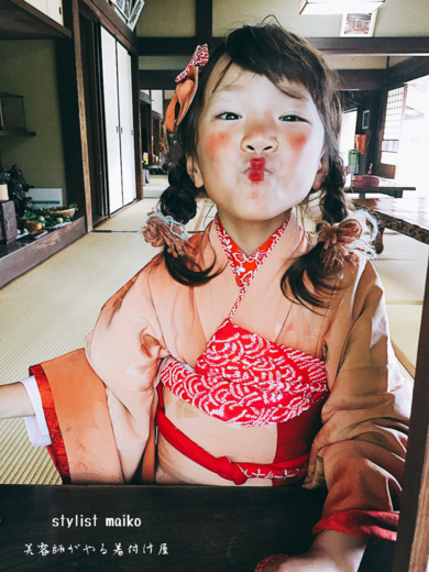 | About My Kimono Outfit | 七五三ちゃん♡ やっぱりキッズは、キッズらしいのがカワイイ。 お着物は、ママとの兼ね合いで、反対色チョイス。 こんな日におさげがまたカワイイ。 毛糸で飾り付け。 |