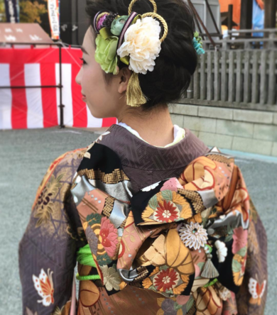 | About My Kimono Outfit | 振袖です。 30年前、祖母が母に仕立てた着物を私も着ました! 髪飾りは母の手作りです! 差し色として緑を取り入れたのがポイントです! |