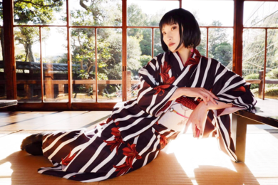 | About My Kimono Outfit | よろけ縞のポリ着物。小物に赤を取り入れてクールなスタイリングにしました。 |