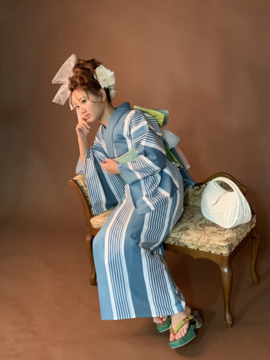 | About My Kimono Outfit | 涼しげなライトグリーンは、若草、青葉 澄んだ川になびく水草色のストライプ 同色の金魚柄の帯を締めて、トータルでコーディネートしています。 トータルデザイン浴衣で、ワンランク上の上品な装いになります |