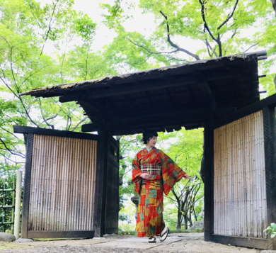 | About My Kimono Outfit | 幾何学模様のオレンジ系お着物にチェックの帯。 大人かわいいお着物コーデで新緑との相性バツグン♪ |