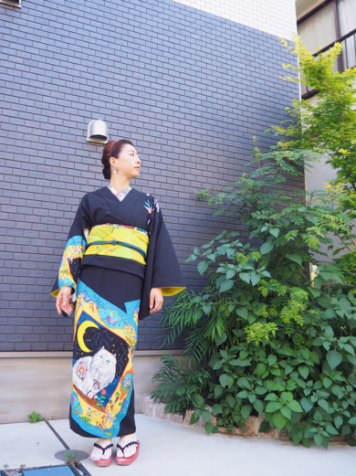 | About My Kimono Outfit | ハセガワアヤさんの新作袷着物ででかけました☆ かなりインパクトのある絵柄で、ねこや星、夜のお気に入りがつまった一着♪ 詳しいコーデはブログにUPしています。 プロフィールからどうぞ★ |