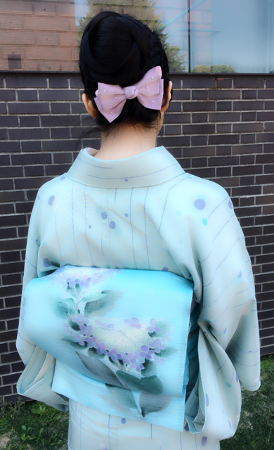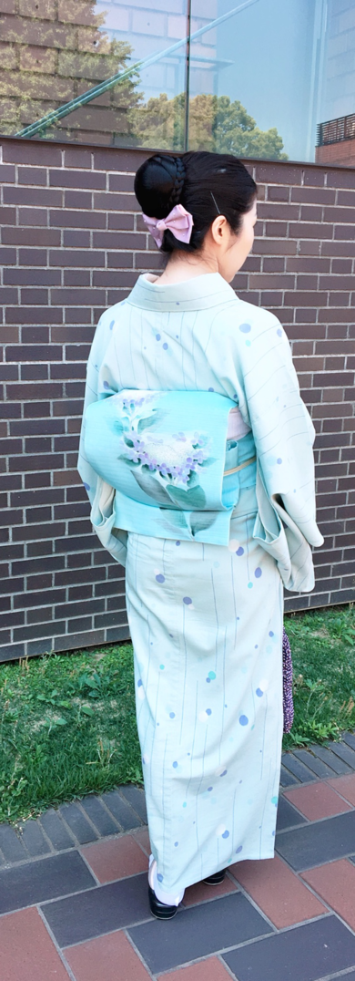 | About My Kimono Outfit | 紫陽花の帯に雨を表したお召しの着物をコーディネート。ブルーカラーで涼しげに, |