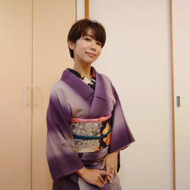 | 着物について | ふだん着物。自分には珍しく、渋めなコーディネートです。金銀の小鳥の刺繍がおちゃめなアンティーク着物です。 |