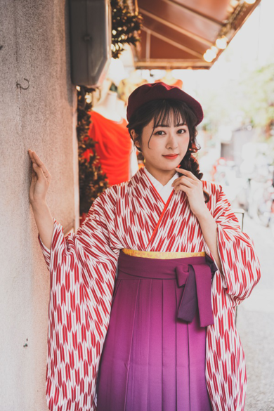 | 着物について | 矢羽根に紫のグラデーション袴 ベレー帽とブーツを合わせてみました はいからさんが通るの紅緒さんになりたいです♪ |