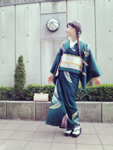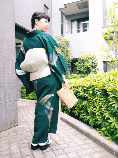 | 着物について | ゴールド・シルバー・ピンクで刺繍された羊歯が羽根のように見えるお召。 深い緑との柄行のバランスが絶妙で即決GETしたアンティークもの。 |