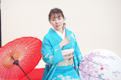 | 着物について | きものクリエイター羽鳥勉氏の『はとり』姉妹ブランド 「紫乃」 鮮やかな水色の地に桜柄の手描き友禅染め振り袖。 ゴールド地の気品さの中に、ストライプがモダンが帯結び。 |