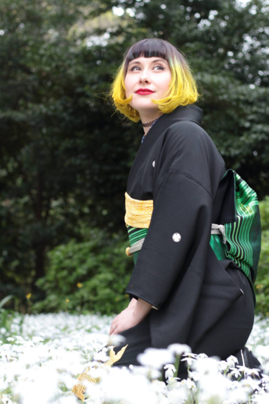 | 着物について | 黒い着物を着るイベントに参加して、黒留袖を選びました。 名古屋帯を後見結びにしました。小物は髪色と合わせる(笑) |