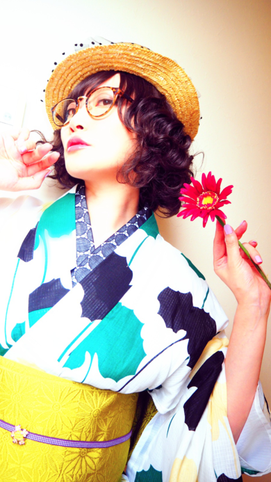 | 着物について | アンティークのPOPな柄の浴衣に合う、POPな小物コーデ。 |